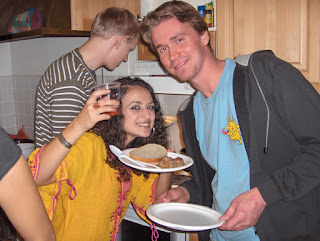 Llegué a la casa de Jussi (Jussi es uno de los que vivía allí y el amigo de Salma) y la verdad es que todo estaba muy avanzado. Ya estaban hechas varias cosas, como las tortillas de patata y las albóndigas. Mientras Salma preparaba sus Crepes marroquíes y otra chica finlandesa cocinaba más cosas, yo me dediqué en exclusiva a la sangría. Receta: Vino, fruta (manzana, naranja y melocotón en almíbar con su almíbar), zumos (depende del gusto de cada uno) y azúcar. También le añadí algo de Vodka, para sentir más el gusto a alcohol. Me quedó rica y eso se notó en la fiesta.